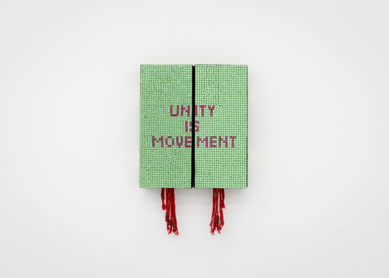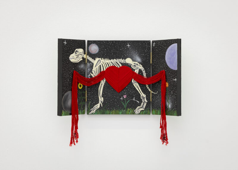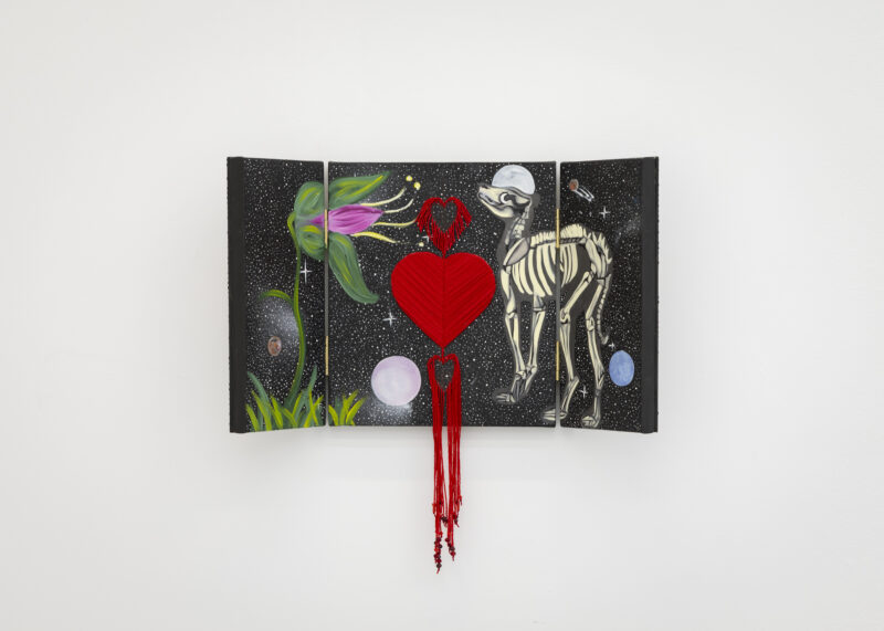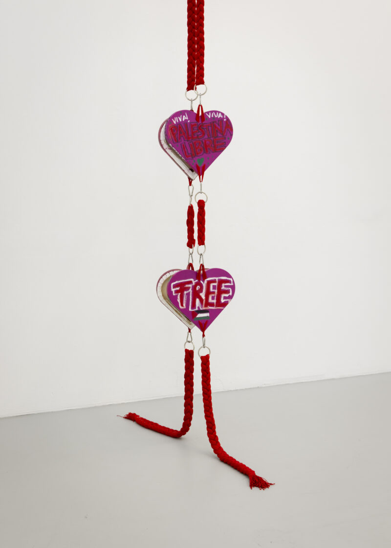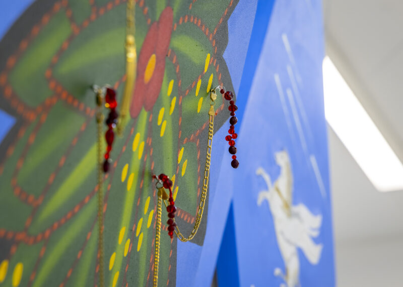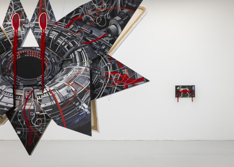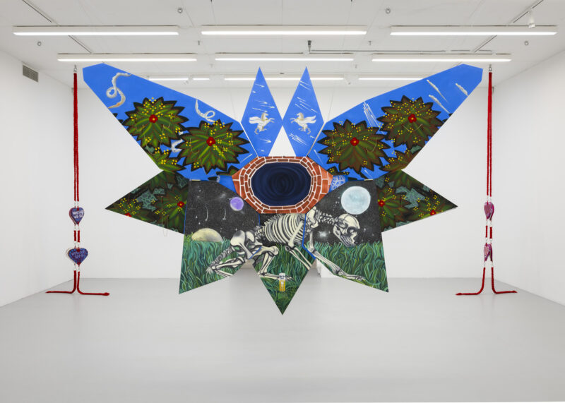 Frieda Toranzo Jaeger arbejder med maleri som en måde at kritisere og frigøre sig fra binære forestillinger og magssystemer. I centrum af hendes aktuelle udstilling på Den Frie er et stort maleri af sammensatte paneler, der hænger ned fra loftet. Værket har en rumlig karakter, som også gør det til skulptur, installation og scene. Det er malet på begge sider, og danner på den måde to verdener, der kontrasterer nutidens teknologiske, kapitalistiske og drømmende virkeligheder.